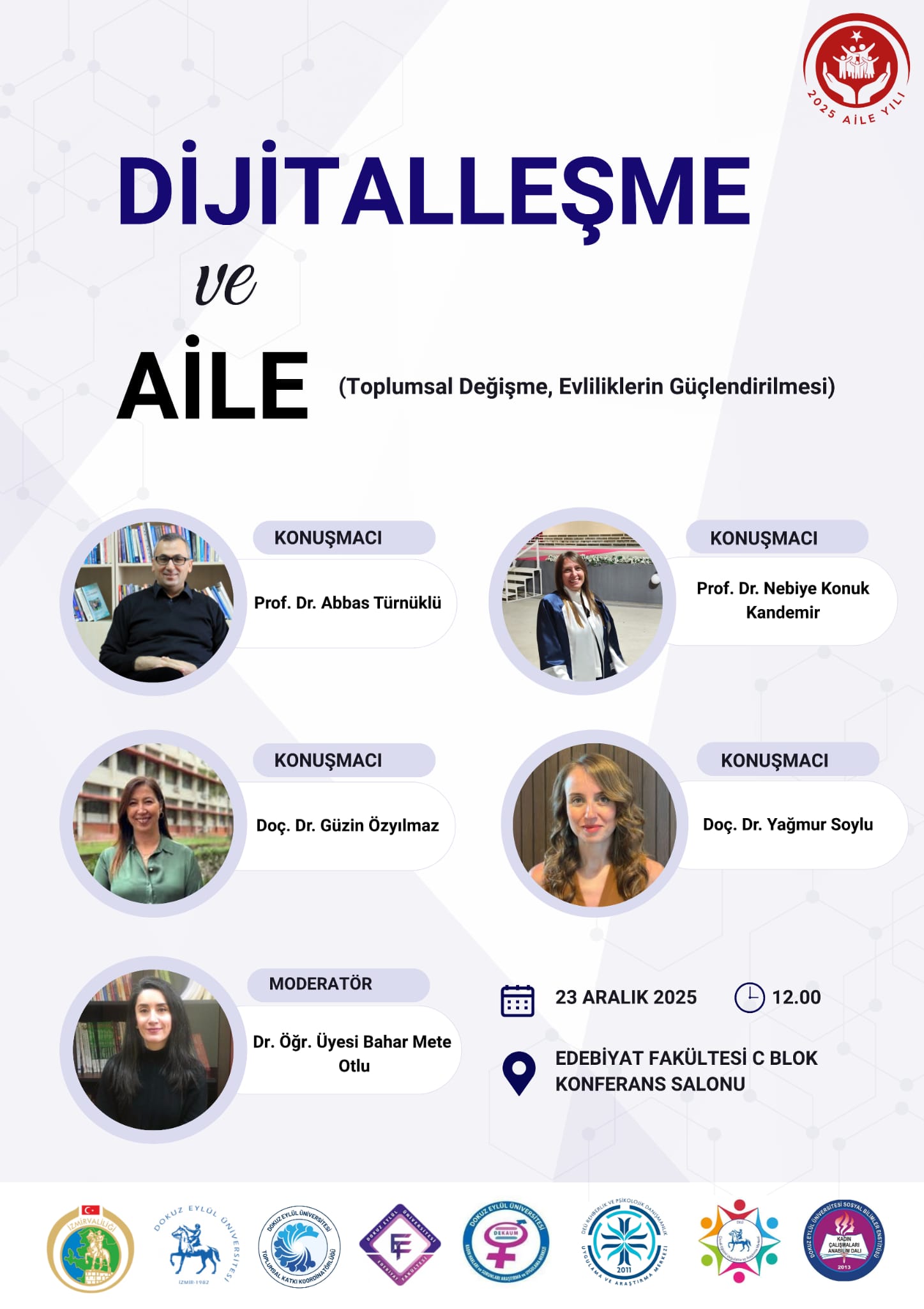 23 Aralık 2025 Tarihli Dijitalleşme ve Aile (Toplumsal Değişme ve Evliliklerin Güçlendirilmesi) Konulu Seminer DEKAUM, İZMİR VALİLİĞİ, DEÜ EDEBİYAT FAKÜLTESİ, DEÜ SOSYAL BİLİMLER ENSTİTÜSÜ KADIN ÇALIŞMALARI ANABİLİM DALI, DEÜ REHBERLİK VE PSİKOLOJİK DANIŞMANLIK ARAŞTIRMA MERKEZİ, DEÜ TOPLUMSAL KATKI KOORDİNATÖRLÜĞÜ tarafından gerçekleştirilmiştir.